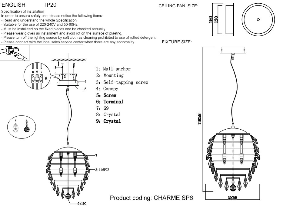 Светильник подвесной Crystal Lux CHARME SP6 CHROME/TRANSPARENT